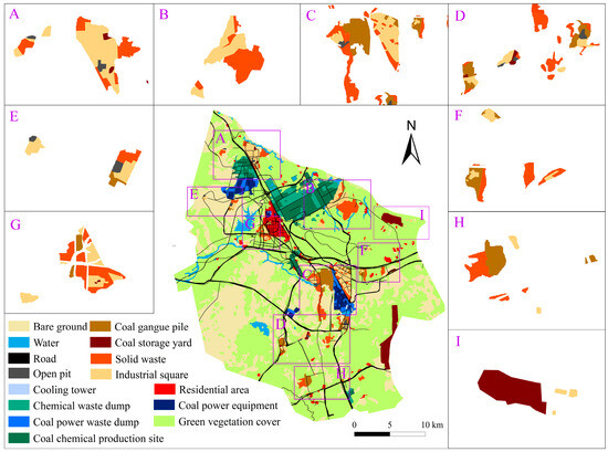 The distribution of coal sites is more scattered, mainly concentrated in the eastern/central part (Figure 5). Ningdong coal mining is mostly shaft mining. The area of industrial squares is 22.07 km2, the area of solid waste is 21.59 km2, the area of coal storage sites is 11.61 km2, and the area of coal gangue piles is 10.25 km2, which take up less land. The area of open-pit quarries is 1.39 km2, and a small amount of accompanying solid waste and coal gangue piles exist around them.