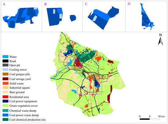 Ningdong coal power base is the most representative coal, coal power, and coal chemical industry cluster bases in China. It is one of the fourteen national large coal bases with a production capacity of 100 million tons, comprising nine large coal power bases generating 10 million kilowatts and encompassing four demonstration zones for the modern coal chemical industry [1]. With the long-term development of industries, the Ningdong coal power base is expected to generate 29.04 million tons of industrial solid waste by 2022, which includes 7.35 million tons of coal gangue and 6.34 million tons of chemical waste [2]. It has led to problems such as a large industrial solid waste disposal gap, open piles of fly ash, gangue dumps, and ore slag piles occupying grasslands [3,4]. These problems not only lead to soil contamination and a waste of resources, but also increase the risk of combined contamination from related solid waste utilization, land compaction, and disposal sites [5]. The identification of site spatial types and risk control strategies are proposed as the key fundamental issues in terms of regional energy resources, low-carbon development, and ecological protection.
