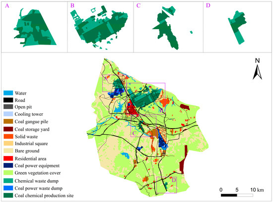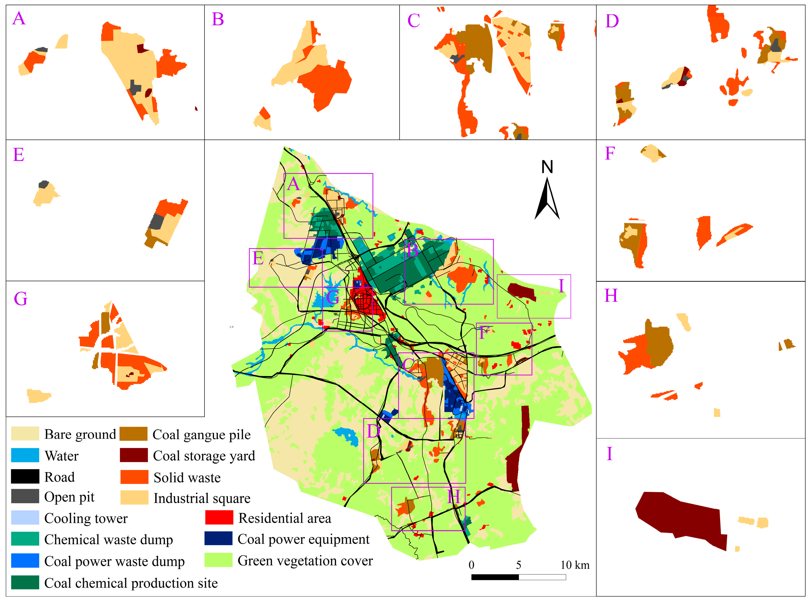 The Ningdong large-scale coal power base has built a coal chemical industry, and its main projects include coal-to-oil, coal-based olefin, coal-based methanol, paraformaldehyde, and so on. Coal chemical industry sites are centrally distributed in the north of the Ningdong coal power base, with a regular and concentrated distribution. A total of 29.13 km2 is occupied by coal chemical industry production sites and 18.54 km2 is occupied by coal chemical industry waste dumps, as shown in Figure 7.