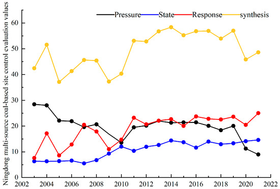 (2) Pressure indicators are classified as negative indicators, indicating a negative correlation between the indicator value and environmental force. A higher indicator value indicates a lesser environmental force. As indicated in Table 8, the indicator value shows a downward trend from 2003 to 2010. The Ningdong coal power base is in the early stage of development, and in conjunction with the protective policy responses, its impact on the environment is relatively limited. The significant increase in the indicator value from 2010 to 2011 can be attributed to the proposal of the “Golden Triangle” energy comprehensive development strategy by Mongolia, Shaanxi, Gansu, and Ningxia in 2010. The extensive development of energy in the Ningdong area has had a discernible impact on the ecological environment. The 2019–2021 indicator value has a certain downward trend, and industrial upgrades of the Ningdong coal power base achieved good results.