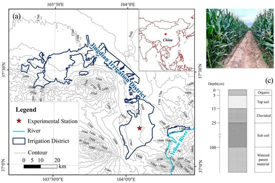 (a) Study area and site; (b) A photograph of the experimental field; (c) Representative soil profile.
