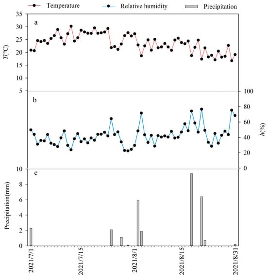 The temperature, relative humidity, and rainfall values observed at the station during the experimental period are shown in Figure 2. The total rainfall from July to August was 24.5 mm, and the maximum cumulative daily rainfall was 9.4 mm, which occurred on August 18. Meteorological data were obtained from the China Meteorological Data Network (http://data.cma.cn/ (accessed on 8 May 2022)).