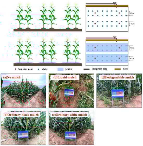 The selected crop type for the experiment was maize, a cash crop with a significant presence in arid areas and a relatively large planted area. The experiment included five treatments: no mulch (NM), liquid mulch (LM), biodegradable mulch (BM), ordinary black mulch (OBM), and ordinary white mulch (OWM) (Figure 3).
