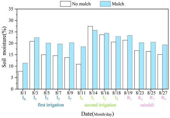 The soil moisture in the fields with mulch (20.9%) was higher than that in the fields without mulch (17.6%) during the experimental observation period. There were two irrigation events and one rainfall event of more than 8 mm during the observation, and after each irrigation or rainfall event, there was a noticeable increase in soil moisture. After the second irrigation, the soil moisture content of the fields with and without mulch reached a maximum. It is worth noting that the water content of the soil without film cover was 20.9% one day after the first irrigation and increased to 27.4% one day after the second irrigation, which is related to the difference in the amount of water between the two irrigations; moreover, the difference in the soil water content before irrigation further affects the water content of the soil after irrigation (Table 1). Except for August 14, the soil moisture in fields with mulch was consistently higher than that without mulch. After irrigation and rainfall, soil moisture decreased faster in fields without mulch, while soil moisture maintained a lower decline rate in fields with mulch. Mulch could reduce evaporation and retain soil moisture better. Meanwhile, mulch blocks the external input water from entering the soil to a certain extent, thus more water infiltrates into the bare surface without mulch. Therefore, after each irrigation or rainfall, the difference in soil moisture between the fields with and without mulch (Figure 4) was reduced.