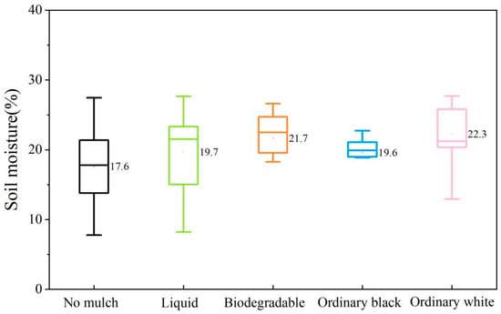 Significant differences arise due to the impermeable polyethylene composition of OBM and OWM, causing the accumulation of a substantial volume of irrigation water in the permeable monopole. This hinders irrigation water infiltration into the soil [44], resulting in a 1.7-fold increase in soil moisture on the 1st day post-irrigation compared to pre-irrigation levels. On the 7th day after irrigation, soil moisture in the fields with different mulch types changed by −7.1% (NM), −6.1% (LM), −2.5% (BM), −0.48% (OBM), and −0.14% (OWM) compared to the 1st day after irrigation. OWM and OBM had the best ability to retain soil moisture, and then BM and LM performed worse but better than NM. LM is an emulsion suspension that is sprayed onto the surface of loose sand grains to form a film that agglomerates the dispersed grains, thereby improving the physical properties of the grains. LM can form a thin film on irregular ground and is easy to decompose and dispose of. Its disadvantage is that the ability to retain soil moisture and soil temperature is open to discussion due to its non-full coverage of the soil surface [40].