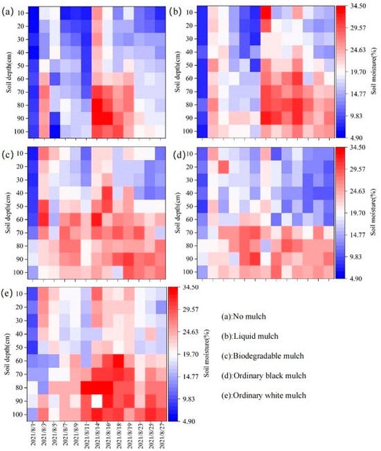 Limited by the availability of irrigation water, the majority of arid areas remain rainfed agricultural areas [47]. In these regions, the suppression of evaporation and an increase in water infiltration are two crucial aspects of soil moisture retention [48]. The analysis of the effect of mulch on soil moisture after rainfall is critically important for agricultural development in rainfed areas.
