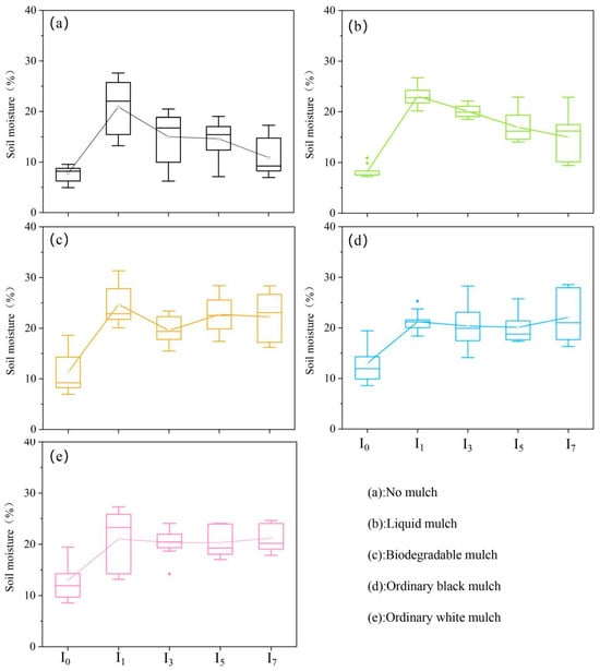 Variation in soil moisture content with irrigation time in different mulched farmlands. The study investigated changes in soil moisture content over time in various mulched farmlands. (The box represents the 25th–75th percentiles, the line indicates the 95th and 5th percentiles, and the point indicates outliers. The line in the box represents the median (50th percentile), the square in the box represents the average value, and the polyline between the boxes connects the averages.) I0: before irrigation; I1: 1st day after irrigation; I3: 3rd day after irrigation; I5: 5th day after irrigation; I7: 7th day after irrigation.
