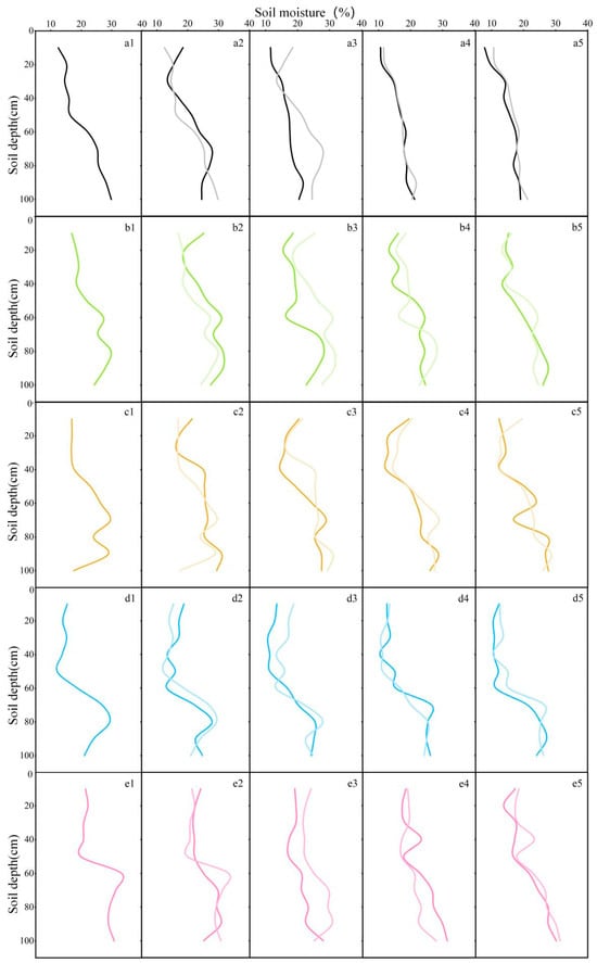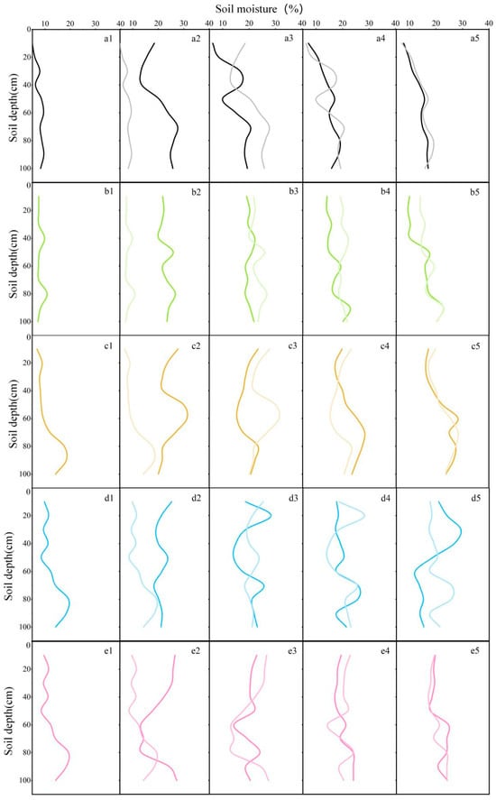 Temporal variations in soil moisture content following irrigation with different mulches. Previous values of soil moisture content are shown in translucent colors. (a1–a5): no mulch; (b1–b5): liquid mulch; (c1–c5): biodegradable mulch; (d1–d5): ordinary black mulch; (e1–e5): ordinary white mulch; (1): before irrigation, (2): first day after irrigation, (3): day 3 after irrigation, (4): day 5 after irrigation, (5): day 7 after irrigation.