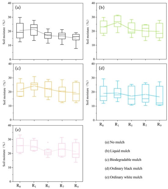 Temporal variations of soil moisture content in different mulch types after rainfall. (The box represents 25–75% percentiles, the required line indicates 95th and 5th percentile, and the point indicates outliers. The line in the box represents median (50th percentile), the square in the box represents average value, and the polyline between the boxes is the connection of the average.) R0: before rainfall; R1: 1st day after rainfall; R5: 5th day after rainfall; R7: 7th day after rainfall; R9: 9th day after rainfall.