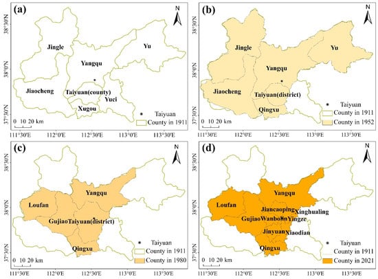Figure 2. Administrative divisions of Taiyuan City in four periods: (a) 1911; (b) 1952; (c) 1980; (d) 2021.
