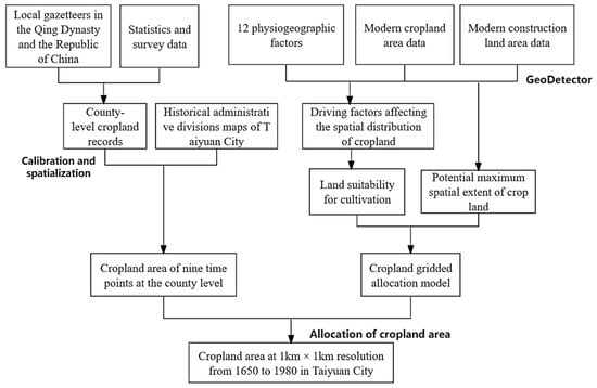 The methodology for reconstructing the historical cropland cover of Taiyuan City includes the following steps. Based on data sourcing from historical gazetteers, agricultural survey data, and statistics from the Qing Dynasty to 1980 and processes of calibration, correction, and extrapolation, we obtain the historical county-level cropland areas in Taiyuan City. Then, driving factors affecting the cropland’s spatial pattern are selected from 12 physiogeographic factors using the GeoDetector tool. Lastly, we construct a cropland gridded allocation model and allocate the county-level historical cropland area during 1650–1980 into a 1 km × 1 km grid (Figure 3).