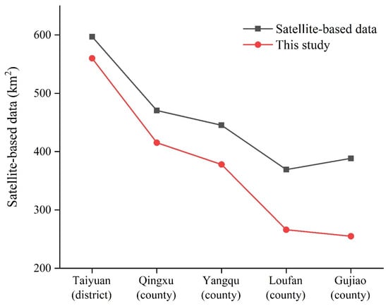 The county-level cropland areas from statistics and survey data in 2009 and 2016 are also collected. By comparison, it is found that the cropland area at the county level in Taiyuan City from survey data is 1.4 times higher than that from the statistics after 2000. In the 1980s, there were no differences between the survey data and the statistics, which reflected that the county-level cropland area in Taiyuan City from the survey data was directly derived from the statistics. We improve the cropland area from statistics in 1980 to be in line with the standard of survey data based on the calibration coefficient of 1.4.