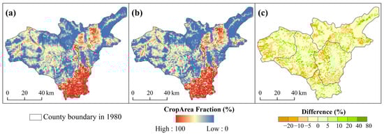 In 1952, the cropland area declined in northern Fenhe River Valley Plain but increased in the southern part. The proportion of grids with cropland more than 70% decreased notably, dropping to 7.92% in 1952. These changes mainly occurred in the northern Fenhe River Valley Plain. Most grids with a cropland area fraction of more than 30% remained in eastern Taiyuan City. Moreover, the cropland expanded in southern Taiyuan City. The land in Qingxu County in southern Taiyuan City was extensively cultivated with an average cropland area fraction of 56.22% (Figure 6h).