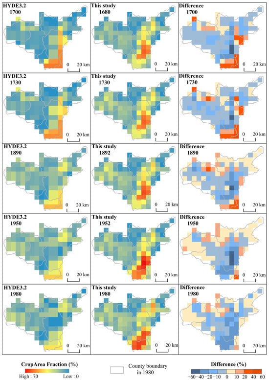 In this study, historical documents, survey data, and statistics are collected to reconstruct the cropland area of each county in Taiyuan City from 1650 to 1980. We construct a cropland gridded allocation model for Taiyuan City and allocate the cropland area to grids with a resolution of 1 km × 1 km. We also validate the accuracy of our results and compare them with the HYDE3.2 dataset. Our reconstruction could enhance the accuracy of the global dataset and serve as base data in studying historical climate change. The major conclusions are as follows.