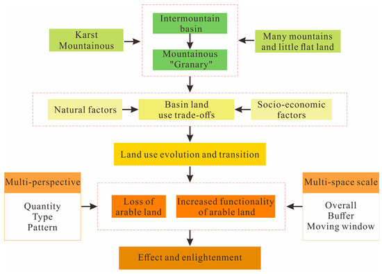 The diversity of social needs, the multi-suitability of land-use, and the plurality of regional development goals have led to diversifying the function of arable land-use [33]. Therefore, how to rationally allocate arable land resources according to the many functions of arable land, to meet the diversified needs of human society for the products and services formed on arable land is the difficulty, and is a hotspot in current arable land protection work [34]. Based on existing studies [31], the authors argue that, during the evolution of the land-use in the basin, the general trend is that the arable land-use function gradually decreases while other functions gradually increase, or although the arable land-use function is still the main feature, the diversity of arable land function continues to increase. Suppose the evolution of the basin’s land-use function is inconsistent with this general trend. In that case, it may be due to natural and socio-economic factors affecting the basin’s land-use function change. Therefore, the land-use transition of the basin is mainly reflected in two aspects: (1) Cultivated land function transfer: Cultivated land is lost due to conversion to construction land, such as residential and industrial and mining storage, transportation, and other land, the amount of cultivated land is reduced, agricultural space is continuously occupied, and cultivated land is converted into non-agricultural land; (2) Increased versatility of arable land: The functions of arable land-use have gradually diversified, shifting from the cultivation of grain crops to the cultivation of non-grain crops, and the formation of large-scale agricultural land [35]. Traditional agricultural space has gradually evolved into modern agricultural space, such as sightseeing agriculture. The above evolution and transformation of land-use in rural basins can be reflected through the spatial and temporal changes in the quantitative aspect of land-use, land-use types, and spatial patterns of land-use landscapes in rural basins, and the formation of different land-use transformation processes and transformation trends in different natural and socio-economic buffers (Figure 2).