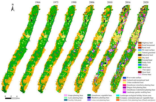 We classified the land-use status of the Lianjiang Basin into 10 categories of first-class land-use according to the current land-use classification standard [37] and the actual situation of the study area: cultivated land (1), forest land (3), grassland (4), industrial and mining storage land (6), residential land (7), public management and public service land (8), transportation land (10), water area and water area facilities land (11), other lands (12), and modern agricultural land (120). Modern agricultural land refers to facility agricultural land with a larger area and scale, such as greenhouse vegetable bases, flower bases, and economic fruit planting bases, with higher land-use intensification and efficiency. Combining the actual conditions of the study area and according to the current land-use classification promulgated in 2017 [37], we divided the second-class land-use status in the Lianjiang Basin area into 30 categories: paddy field (11), dry land (13), forested land (31), shrub land (32), natural grassland (41), industrial land (61), urban residential land (71), rural homestead (72), cultural and recreational land (85), highway land (102), street land (103), rural road (104), river water surface (111), pit water surface (114), ditches (117), free space (121), flower base (12011), landscape garden seedling base (12012), lawn planting base (12013), lotus root planting base (12021), greenhouse vegetable base (12022), company contracted open-air vegetable base (12023), greenhouse strawberry planting base (12031), grape planting base (12032), dragon fruit planting base (12033), blueberry planting base (12034), greenhouse watermelon planting base (12035), economic fruit planting base (peach and plum) (12036) landscape ecological holiday leisure area (12041), and fish pond facility (12051) (Figure 3). The resolution of the remote sensing images in the study area at seven time periods was not consistent, so the authors conducted several field surveys for modification and validation, and the accuracy of the data reached more than 90%; on the other hand, the obvious changes in land-use in the study area occurred after 2000, so the difference in the resolution of the remote sensing images at seven time periods will not affect the results of this paper.