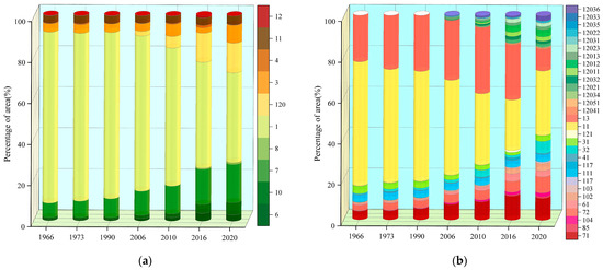 (a) Area change of first-class land-use in the study area; (b) Area change of second-class land-use in the study area.