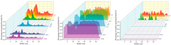 This paper selects the number of modern agricultural land types, PD, and SHDI of each buffer zone to reflect each buffer zone’s landscape characteristics and changes (Figure 11). The change curves of the number of modern agricultural land types and the PD of modern agricultural land are basically consistent with the change patterns of the percentage of modern agricultural land in each buffer zone, and the change patterns of the percentage of construction land and cultivated land in each buffer zone show roughly opposite trends.