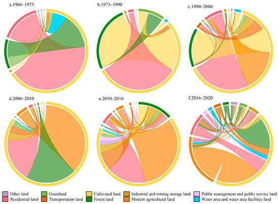 The transition changes in the overall land-use quantity of the basin in the study area are mainly reflected in three aspects: decreased cultivated land, increased residential land, and modern agricultural land (Figure 4a). Since the 1960s, the Lianjiang Basin as a whole has still been dominated by cultivated land as the main land type. However, over the past 50 years, the amount of cultivated land has shown a decreasing trend, while all other types of land have increased, except for fluctuations in the area of forest land types. From 1966 to 1990, the cultivated land area of the basins did not change significantly (71.52 to 69.53 km2); from 1990, the cultivated land area began to decrease. By the end of 2020, the cultivated land area of the basin was only 37.54 km2, of which the largest decrease was from 2010 to 2016; at the same time, the growth of residential land and modern agricultural land during the study period was also the largest, and modern agricultural land has increased significantly since 2010.