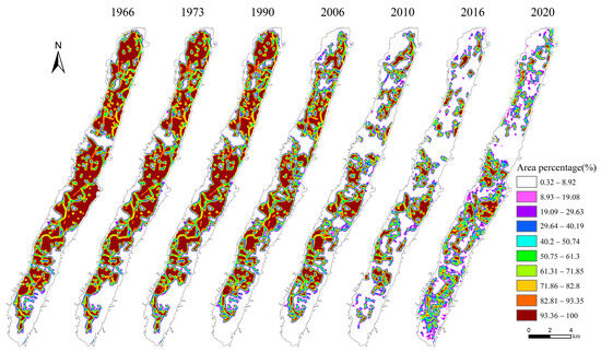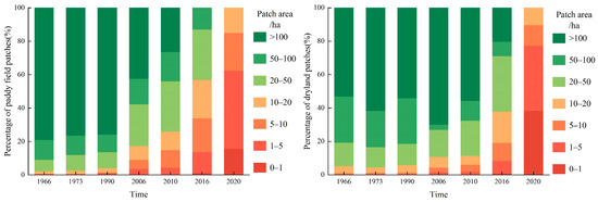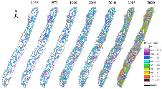Before 2006, the area of paddy fields and dry land in the basin was greater than 100 ha and 50–100 ha, respectively; after 2006, the area was mainly 20–50 ha (Figure 8). Paddy fields dominate cultivated land in the study area, and the spatial distribution of the percentage area composition of paddy patches and the percentage in the unit area showed that the degree of fragmentation of paddy fields increased significantly in 2006 and later. With the evolution of land-use in the basin, cultivated land is gradually occupied and transformed, which not only led to the fragmentation of cultivated land patches and the evolution from a centralized to a fragmented pattern (Figure 9), but also led to the land-use diversity index moving from low to high, and the land-use pattern becoming gradually more complex (Figure 10).