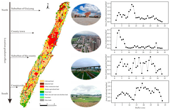 Specifically in the buffer zone, industrial land is mainly distributed in 2–4 strips around suburban Guiyang, showing an inverted “V” trend of “upward-decline.” The urban construction land is primarily concentrated in Huishui County, showing a normal distribution from north to south, but the distribution area in the northern Guiyang suburb is significantly higher than in the suburban county and countryside areas in the south. The cultivated land is mainly concentrated in the southern part of the study area, and the trend in cultivated land area and urban construction land area showed an opposite change on each strip. Modern agricultural land is distributed in a “jagged” pattern from north to south, with high values mainly located in the suburban Guiyang, the suburban county, and in the vicinity of the village of Haohuahong in the south.