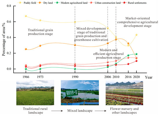 We further analyzed the changes in the secondary land types of the basin; its land-use transition changes continue to be reflected in three aspects: (1) paddy fields decreased significantly, and dry land remained basically unchanged; (2) the landscape of modern agriculture, such as flowers and seedlings, increased significantly; (3) construction land, such as urban and rural settlements and industrial land, increased (Figure 4b). Land-use transformation is changing from one land-use pattern (including dominant form and recessive form) to another in the region over time, driven by socio-economic changes and innovations [42]. Our research found that the basin’s land-use form was stable from 1966 to 1990; since 2006, the land-use status of the basin has changed significantly; that is, land-use transition has occurred.