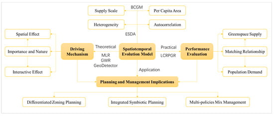 In the national spatial planning system, the planning for urban green areas is one of the most important projects, aimed at providing high-quality ecosystem services and public spaces for residents in China. Scientific planning of the quantity, quality, and spatial structure of the supply of urban green areas, especially Urban Park Green Areas (UPGAs), will significantly foster a more sustainable and livable urban environment [1,2]. In addition, as the construction of the Yangtze River Economic Belt, the protection and utilization of the Grand Canal and the construction of its cultural belt, and the ecological protection and high-quality development of the Yellow River Basin have been successively upgraded to national strategies, watershed spatial governance has become a key task of territorial spatial planning and a hotspot in academic research [3]. Therefore, quantitatively analyzing the spatio–temporal evolution patterns and driving mechanisms of UPGAs from a regional holistic perspective and evaluating the performance of land supply and demand will provide a basis for green infrastructure planning practice in watersheds and will help establish a technological system adapted to territorial spatial planning in these areas.
