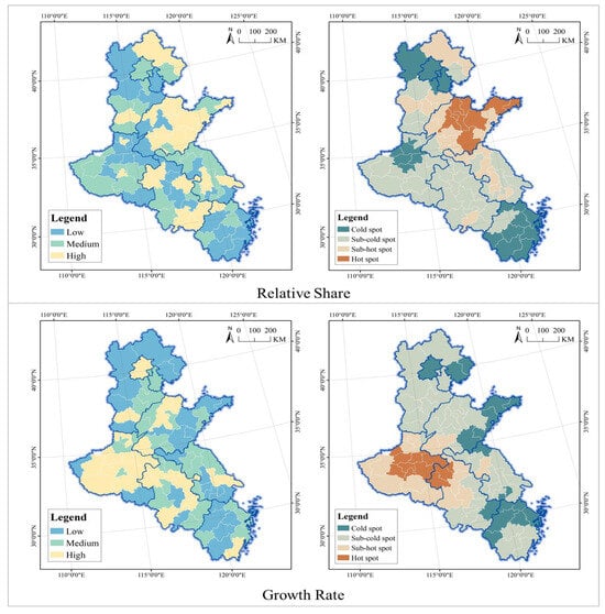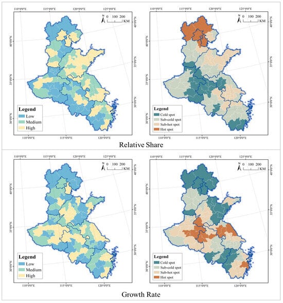 Relative share and growth rate spatial analysis of the supply scale of UPGAs in the Grand Canal of China.