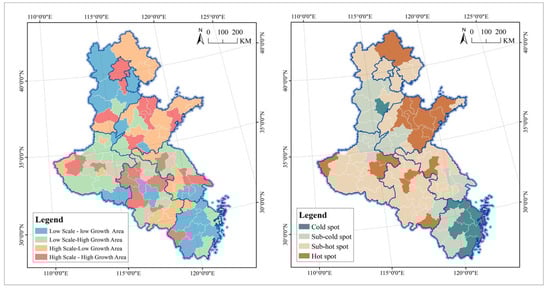 According to the growth of UPGA supply scale, the CV and Moran’s I are 0.70 and 0.01 (Z = 0.61, p > 0.05), respectively, indicating that neither the inter-urban differences nor the spatial correlations are significant. High-value cities are not spatially clustered geographically, and include Nantong, Fuyang, Zhengzhou, Wenzhou, Jining, Kaifeng, Ningbo, Chuzhou, Shangqiu, Yancheng, Taizhou, Qingdao, Suqian, and Liaocheng. Most of the low-value areas are clustered in northern Hebei and southeastern Shandong, with Pingdingshan, Luohe, Xinxiang, Qinhuangdao, Rizhao, Huaibei, Wuxi, Handan, Chizhou, Zhenjiang, Zhangjiakou, and Tangshan lagging behind in development, and Chengde in particular showing negative growth. The hotspot cities are mainly in the border areas of Henan, Anhui, and Shandong Provinces and extend to central Jiangsu. The sub-hotspot cities are distributed in the periphery of the hotspot cities in a “center-edge” structure. In southeastern Zhejiang, a small “center-edge” structure is developing. The coldspots are concentrated in Beijing, Tianjin, northern Hebei Province, central Shandong Province, and the border areas of Anhui and Zhejiang Provinces.