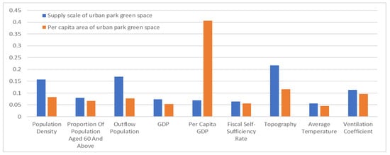 The analysis results from the machine learning regression algorithms show a high goodness, generally greater than 0.85, with decision tree being optimal in both schemes. The results of the four algorithms are in general similar. Although there are differences in the coefficients of factors with higher and lower importance, their ranking remains relatively stable (Table 4). To provide full play to the advantages of all algorithms and eliminate the defects of a single algorithm, this paper uses the average values of four algorithms to determine the importance of factors. For the supply scale of UPGAs, topography, outflow population, and population density have much higher importance than other factors, and they are defined as key factors; fiscal self-sufficiency rate and average temperature have much lower importance than other factors, and they are defined as auxiliary factors with direct influences that can be ignored; and ventilation coefficient, proportion of population aged 60 and above, GDP, and per-capita GDP are not more or less important and are defined as important factors. For per-capita area of UPGAs, per-capita GDP is a key factor; fiscal self-sufficiency rate, GDP, and average temperature are auxiliary factors; while topography, ventilation coefficient, population density, outflow population, and proportion of population aged 60 and above are important factors (Figure 7).