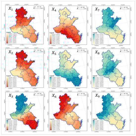 From the per-capita area of UPGAs, only the minimum value of per-capita GDP () is greater than zero, indicating that it plays a positive driving role. The maximum values of outflow population (), GDP (), topography (), average temperature (), and ventilation coefficient () are all less than zero, suggesting that they all act as negative obstacles overall. The maximum values of population density (), proportion of population aged 60 and above (), and fiscal self-sufficiency rate () are greater than zero, while the minimum values are less than zero, indicating that they both have positive driving and negative blocking effects with a complex impact mechanism (Table 6). The influence of population density is characterized by a geographic gradient of “high in the coastal area and low in the inland area”, with the two clusters in the Shandong Peninsula and the northern end of Hebei being the highlands, and the contiguous band-like areas in Henan, Anhui, and western Zhejiang being the depressions. The influence of the proportion of population aged 60 and above presents a “dumbbell” pattern geographically, with the Yangtze River Delta as the highland of positive influence and Beijing–Tianjin–Hebei as the highland of negative influence, divided by the border area of Henan, Shandong, and Hebei. The influence of the outflow population is geographically characterized by “high in the north and low in the south”, with Beijing–Tianjin–Hebei being the highland and the Yangtze River Delta being the depression. The influence of GDP is characterized by a geographic gradient of “high in the inland area and low in the coastal area”, with the highlands located in the border area between Anhui and Henan and the depressions in the Shandong Peninsula and the east coast of Zhejiang. Per-capita GDP and outflow population are highly similar in their geographic patterns of influence, except that the nature of the influence shifts from negative to positive. The influence of the fiscal self-sufficiency rate, the proportion of population aged 60 and above, and topography is geographically characterized by a “low in the center and high at the edge”, with depressions located in the border areas of Anhui, Henan, Shandong, and Jiangsu and highlands in the Shandong Peninsula, both with a small spatial scale. The average temperature influence highland is located in the border areas of Zhejiang, Anhui, and Jiangsu Provinces, and the depression is in Henan. The geographic pattern of influence of ventilation coefficient and outflow population is similar; however, the coverage of the latter uplands and depressions is larger than that of the latter, with highlands extending to the north and west of Henan and depressions expanding to the south of Jiangsu and the south of Anhui (Figure 9).