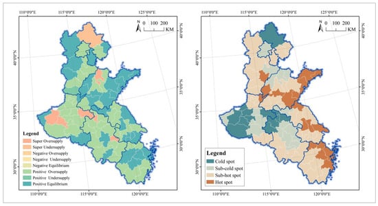 No cities in the Grand Canal region fall into the categories of negative oversupply, negative undersupply, or negative equilibrium. Positive oversupply has the highest proportion, more than 50%, followed by positive equilibrium at approximately 30%. Ma’anshan, Huaibei, Binzhou, Luoyang, Pingdingshan, and Shangqiu are super oversupply members. The only member of the super undersupply group is Chengde, while the only member of the positive undersupply group is Handan. The positive oversupply members include Beijing, Tangshan, Xingtai, Cangzhou, Langfang, Hengshui, Nanjing, Nantong, Lianyungang, Huai’an, and others. Most of these are clustered in Henan and Anhui and extend in a band towards Jiangsu, Zhejiang, and Hebei. The positive equilibrium members include Tianjin, Shijiazhuang, Qinhuangdao, Baoding, Zhangjiakou, Wuxi, Xuzhou, and others. These are distributed in bands in Shandong and Hebei and in clusters in Jiangsu and Zhejiang. Overall, there are three clusters of hotspot cities in Shandong, Jiangsu, and Zhejiang and three clusters of coldspot cities in Henan, the northern end of Hebei, and the border area between Henan and Anhui, with sub-hotspots and sub-coldspots distributed on their periphery, forming a “center-edge” spatial structure (Figure 10).