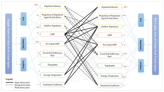 Different factors show a significant synergistic enhancement effect, mainly in the form of nonlinear enhancement, with only a few factor pairs in double enhancement. For the supply scale of UPGAs, the factor pair of topography ∩ average temperature (∩) is in double enhancement. For the per-capita area of UPGAs, population density ∩ proportion of population aged 60 and above ∩ proportion of population aged 60 and above (∩), population density ∩ GDP (∩), proportion of population aged 60 and above ∩ GDP (∩), and proportion of population aged 60 and above ∩ average temperature (∩) are in double enhancement. It is worth noting that a large number of super-factor pairs arise from factor interaction, and their interaction forces are much higher than those of other factor pairs and single factors. Population density ∩ GDP (∩), proportion of population aged 60 and above ∩ GDP (∩), outflow population ∩ GDP (∩), per-capita GDP ∩ GDP (∩), and ventilation coefficient ∩ GDP (∩) are super factor pairs of the supply scale of UPGAs, with an interaction force of more than 0.80. Population density ∩ per-capita GDP (∩), outflow population ∩ Per-capita GDP (∩), outflow population ∩ average temperature (∩), outflow population ∩ ventilation coefficient (∩), per-capita GDP ∩ average temperature (∩), and per-capita GDP ∩ ventilation coefficient (∩) are super factor pairs of the per-capita area of UPGAs, with an interaction force of more than 0.5 (Table 7).