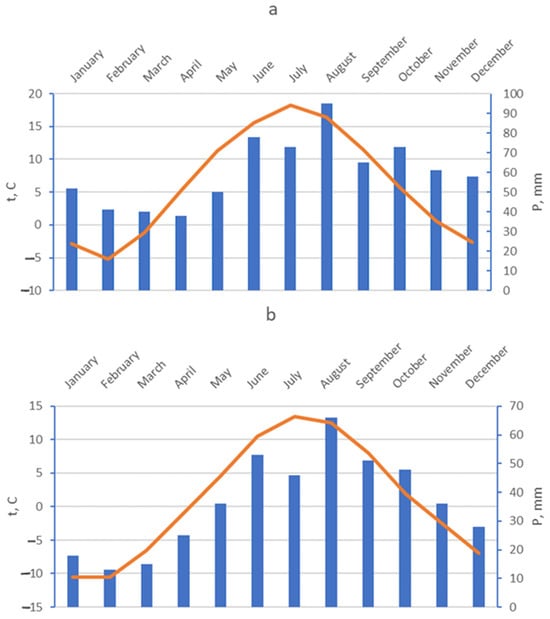 Climatic diagrams of the study sites: (a) Gakkovo, (b) Kolezhma. Columns show monthly precipitation; lines show mean monthly temperatures.