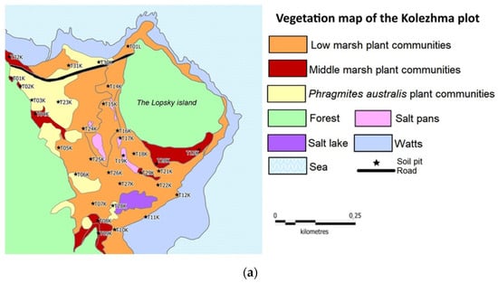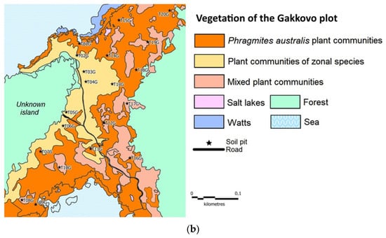 Vegetative communities of the studied tombolos, with the indication of sampling sites: (a) Kolezhma plot; (b) Gakkovo plot. Modified after [] with permission.