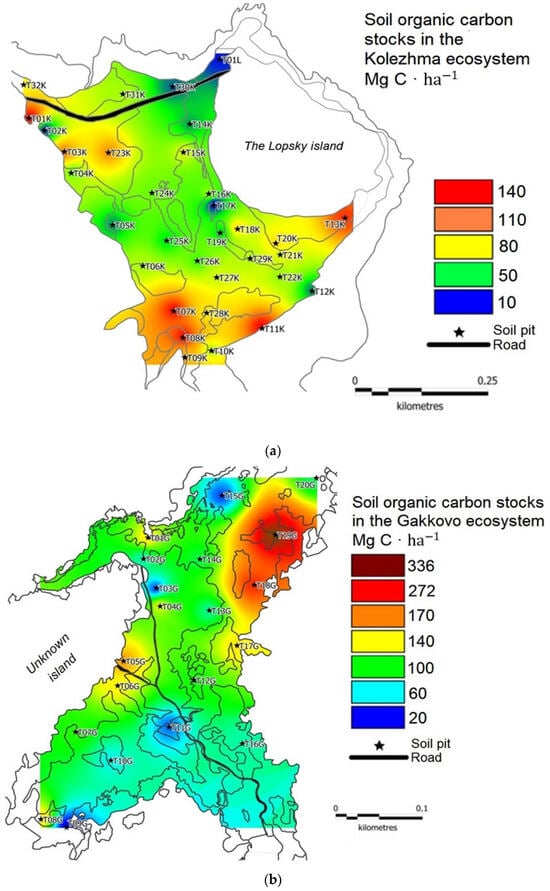 C stock in soils, Mg C·ha−1: (a) Kolezhma plot; (b) Gakkovo plot.
