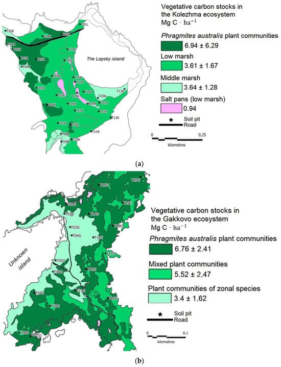The reserves of C incorporated in vegetative biomass varied depending on the plant communities. P. australis is one of the most common invasive species worldwide []. The maximum reserves of plant C at both the Kolezhma and Gakkovo plots were found precisely in the territories occupied by reeds: 6.94 ± 6.3 Mg C·ha−1 at the Kolezhma plot and 6.76 ± 2.41 Mg C·ha−1 at the Gakkovo plot. The high value of the standard deviation for the Kolezhma object is due to the fact that some individual reeds reached a height of more than 2 m, and some plants were only 30–50 cm in height. The obtained values were much lower than those reported for the marshes in New Jersey [], where the biomass of reeds turned out to be 17 Mg C·ha−1. Most probably, the difference is due to much warmer climatic conditions on the Atlantic coast of the USA than on the coasts of the Baltic and White seas. C reserves in other plant associations, except for communities of P. australis, turned out to be less than the average global carbon reserves on the marshes, but of the same order—4.3 ± 0.10 Mg C·ha−1 []. Also, plant communities affected soil C reserves. On the other hand, it is known that emergent plants can influence the movements and deposition of water and nutrients across ecosystems, with the effects varying between different plant species [].