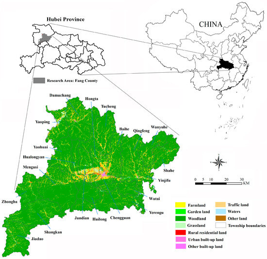 Fang County, a typical mountainous area, is situated in the southeastern corner of Shiyan City, Hubei Province, Central China (Figure 1). It has extreme geographical conditions and an elevation that rises more than 2200 m from the lowest point to the highest, with the slopes in the south being generally steeper than those in the north [31]. Adjacent to the northern urbanized area of Shiyan, Fang County experiences the spillover effects of social and economic changes of its neighbors. The desires to convert local rural lands to urban use are strong, and rural areas become more depopulated with time. Both natural and economic vulnerabilities limit the development of rural areas. Affected by the outbreak of COVID-19, a national lockdown, and economic fluctuations, the urbanization rate of Fang County in 2022 was less than 44%, an initial goal in land-use planning [32].