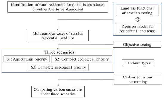 The RRLD and its carbon emission response were linked by proposing an analytic framework (Figure 2). First, RRLs that were abandoned or vulnerable to abandonment were identified. Second, a land-use function orientated zoning technique and a decision model were used to design the repurposing cases for RRLD. Third, a scenario analysis was used to predict the RRLD by setting up three different scenarios by 2025. Last, the changes in carbon emissions or the sequestration capacity under three scenarios were accounted for based on the carbon emission coefficient of different land-use types. Specifically, the three scenarios of RRLD include the following: S1 was defined as the agricultural priority, S2 was defined as a compact ecological priority, and S3 was defined as the complete ecological priority.