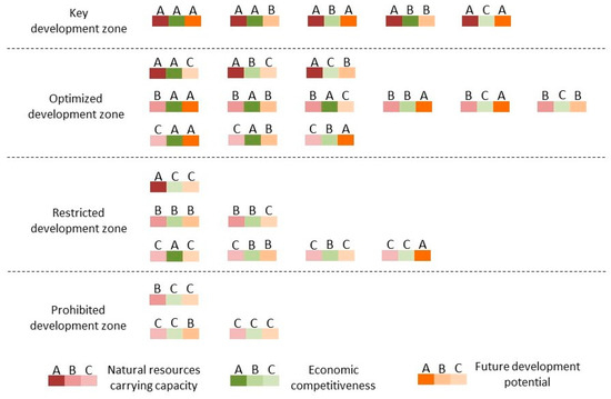 The classification trinity cases and corresponding four function orientated zones are shown in Figure 4. As described previously, A, B, and C indicate three grades of each criterion layer from high to low.