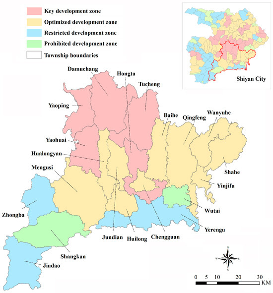 In China, any land-use strategies should follow upper-level planning and policies, in which functional zone planning directs the territorial development, protection, and restoration process [33]. In fact, multiple land-use benefits derived from land-use planning and guidelines are well documented by Chinese scholars [34,35,36]. Relevant studies have also made significant progress in connecting the land-use reallocation with a spatial planning [37]. Therefore, the focuses of the case study should clarify how a RRLD coordinates with spatial planning and land-use limitations, and how different RRLD schemes achieve both agricultural and ecological goals.