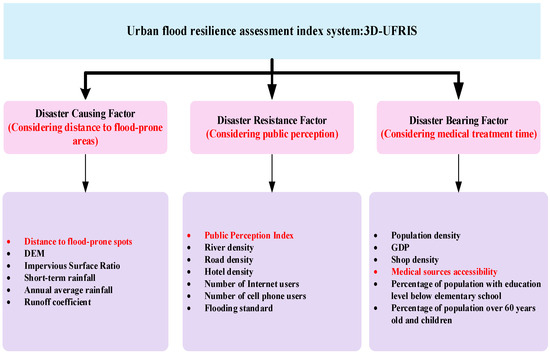- An urban flood resilience indicator system, 3D-UFRIS, was proposed. On the basis of summarizing the deficiencies of existing research index systems, improvements were made to address these deficiencies. We introduced new ways to measure disaster-causing factors, like flood-prone areas. To assess how well residents respond to disasters, we created a public perception index. We also added a measurement for medical resource accessibility to evaluate whether residents could receive timely medical help during disasters. The improved index system followed the principles of independence, quantification, and spatial quantification and selected 19 indicators from multiple levels, including public perception, economy, infrastructure, society, and ecology, to construct the index system composed of a target layer, criteria layer, and indicator layer.