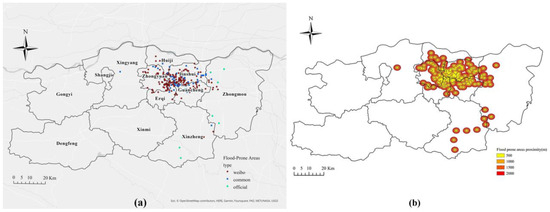 Figure 4a illustrates the spatial distribution of flood-prone areas in Zhengzhou. The red dots represent flood-prone areas identified based on the data extracted from Weibo, while the green dots represent officially announced flood-prone areas. The blue dots indicate the overlapping areas between the flood-prone areas identified by us and those officially announced. Flood-prone areas identified through social media sources complement the officially announced ones, offering valuable supplementary information. These areas are predominantly situated in the central urban areas and are concentrated in low-lying zones, including subway stations, bridges, and tunnels.