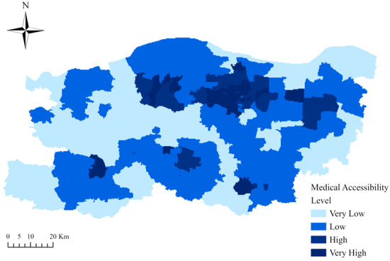 We categorized accessibility into four levels: first-level accessibility for values below 3, second-level for 3–10, third-level for 10–70, and fourth-level for values above 70. The higher the level, the better the accessibility. The first level indicates untimely medical treatment, the second level indicates basic timeliness, the third level indicates good timeliness, and the fourth level indicates excellent timeliness. Figure 6 shows the distribution of accessibility in Zhengzhou.