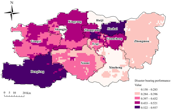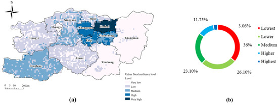 - The distribution of urban flood resilience in Zhengzhou was evaluated. To evaluate the urban flood resilience of Zhengzhou, we obtained remote sensing image data, social media data, POI data, and historical yearbook data. Flood resilience was classified into five levels: highest resilience, higher resilience, medium resilience, lower resilience, and lowest resilience. The highest resilience covered only 3.06% of the area and was mainly located in the Jinshui district, with high economic and public perception and serious waterlogging. The higher resilience covered 11.75% of the area and was mainly located in Zhongyuan District, Erqi District, and Guancheng District, with dense population and buildings, with high public perception and medical accessibility. The lowest resilience areas covered the largest area (36%) and were found in Zhongmou County, Xinzheng City, and Shangjie District, with low public perception and medical accessibility.