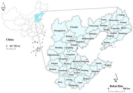 This study focused on 44 cities (prefecture-level and above) in the Bohai Rim region of China. The years 2000, 2005, 2010, 2015, and 2020 were selected as timepoints, enabling the urban sprawl of the region to be measured every 5 years from 2000 to 2020. Two categories of data were used: