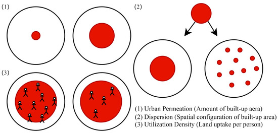 In a reporting unit (white), urban sprawl increases when (1) the built-up area grows, (2) the built-up area becomes more dispersed, or (3) the utilization density decreases (redrawn from Jaeger and Schwick [18]).
