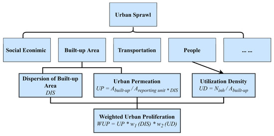 The WUP model considers three aspects of urban sprawl: UP, DIS, and UD (Figure 3). The formula for WUP is as follows: