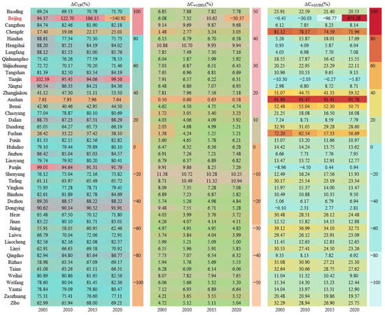 In general, the Bohai Rim region was characterized by moderate-to-high levels of urban sprawl from 2000 to 2020 (Figure 4). In total, 77.3% of the cities in the Bohai Rim region were classified as areas of moderate or high urban sprawl. Specifically, areas with high levels of urban sprawl were mainly distributed around provincial capitals and municipalities directly under central government control near the coastal economic belt, forming a C-shaped distribution around the Bohai Sea and parts of the Yellow Sea coastline. Areas with moderate levels of urban sprawl tended to radiate outward from high-value areas within Shandong Province, while the level of urban sprawl in other peripheral cities was mostly low.