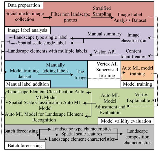Aiming to address the current issue of the sustainable development of urban habitats impacted by the destruction of lake parks (LPs), in this study, an Automated Machine Learning (Auto ML) model was developed for image classification and content recognition. This model was based on the Google Cloud Vision algorithm. Additionally, the DeepLab v3+ model was used for semantic image segmentation to analyze lake park imagery features (LPIFs) and public perceived preferences (PPPs) at two levels. The technical route for the construction of the image classification and content recognition model using the Auto ML model is depicted in Figure 1.